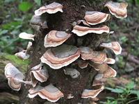 サルノコシカケ科のきのこの仲間で、広葉樹などの枯れ木に多数重なり合って発生します。 傘の表面の色は濃青色、暗褐色、茶黒色だったりと多彩で、形は半円形から扇形をして薄く強靭な革質状です。 傘の大きさは1〜6cmぐらいで似たような仲間も多くあります。